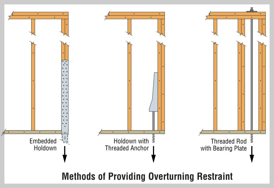 - Holdown with Threaded Anchor: 국내에서 가장 많이 사용하는 방법. 앵커볼트를 콘크리트 기초에 고정시키고 상부의 U자형 홀드다운 철물을 스터드에 못으로 고정.