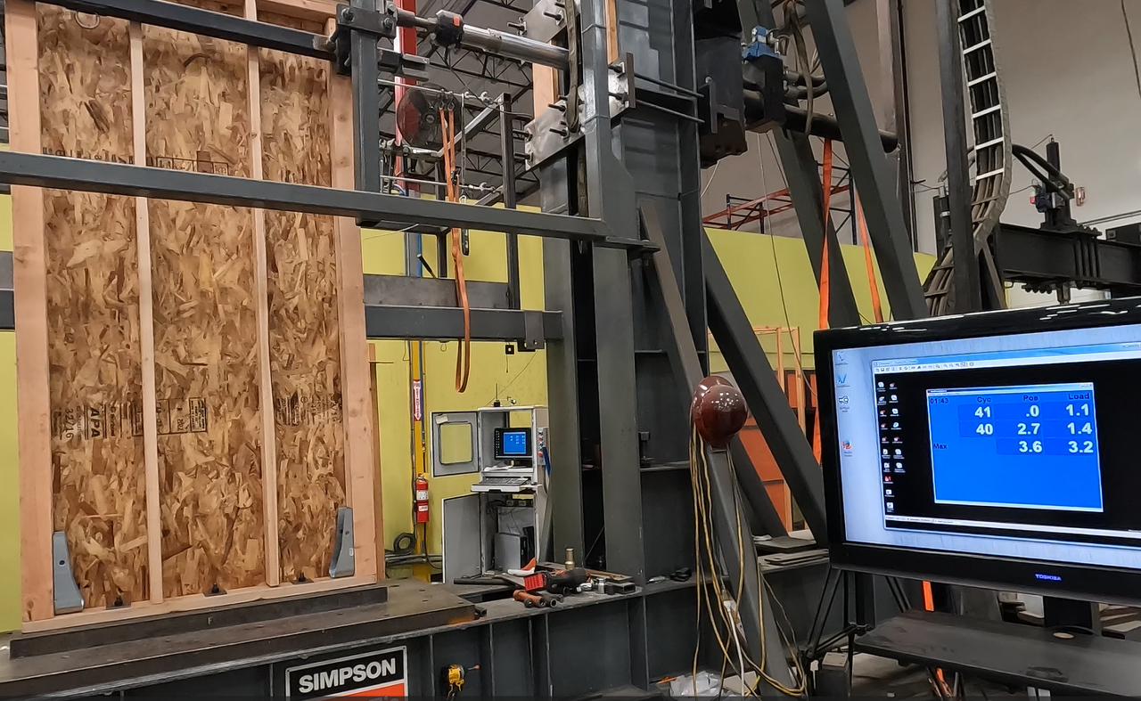 지난 4월 말 미국 Simpson Strong-Tie 사의 초청으로 미국 LA 근교에 위치한 공장 및 연구시설을 둘러볼 기회를 가졌다. 이곳에서 두 가지의 전단벽(Shearwall)의 수평하중 저항성능 테스트를 직접 눈으로 보며 그 결과를 확인할 수 있었다. 동일한 조건의 2개의 전단벽에 홀드다운을 설치 한 벽과 설치하지 않은 벽의 수평 하중 저항 테스트였다. 그 결과를 보면 홀드다운 철물이 지진이나 바람에 의한 수평 하중에 얼마자 잘 견디는지 알 수 있다.