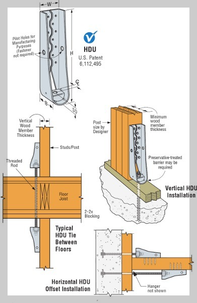 홀드다운(Holdown)은 목조건축물 설계에서 사용되는 구조보강용 연결철물 제품이다. 주로 나선형의 형태를 가지며, 목재 기둥과 벽면을 콘크리트 기초와 구조적으로 연결시켜 고정된다. 홀드다운은 목구조물의 수직 하중과 수평 하중을 안정적으로 전달하고 분산시키는 역할을 수행한다. 아래 이미지는 미국의 세계적인 철물제조회사인 심슨 스트롱타이(Simpson Strong-Tie)사의 홀드다운의 종류와 설치 방법-기초와 벽스터드의 연결, 층과 층의 스터드 연결, 수평연결을 보여준다.